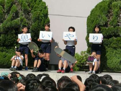 副校長先生からは、10〜40年もの間使い続けている愛用品が紹介されました。その根底を流れる心は、物を大切にしようとする「思いやり」であり、永く付き合っていく上で欠かせないという話がありました。グッズやカードを担当した8人は、自主的に名乗りをあげてくれたメンバーたちです。セリフはなくても、きりっとした姿勢で、立派に役割を果たしてくれましたね。