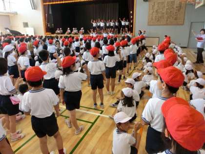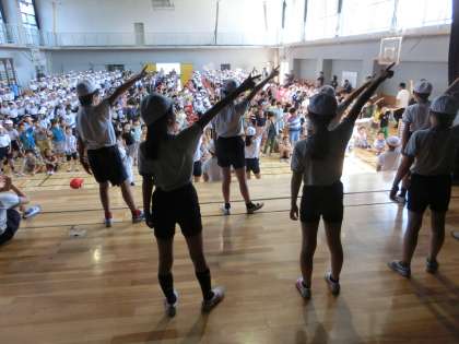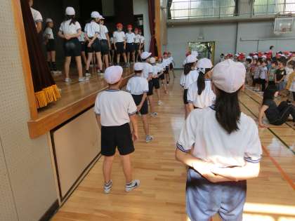 音楽朝会も今回は運動会バージョンです。「運動会のうた」と「校歌」を練習しました。特に前者では、応援団が先頭に立って、力強い振り付けを披露しながら、全体をリードしていました。上学年が模範を示し、その場を盛り上げていく松小の校風を感じ取る度、その素晴らしさに感動してしまいます。さめた空気がないことは、子どもたちが伸びていく上で大きなアドバンテージとなります。