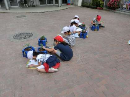 5種類の野菜の苗を植えた2年生が、その後の様子をスケッチしたり、水やりをしたりしています。運動会練習合い間の生活科学習です。