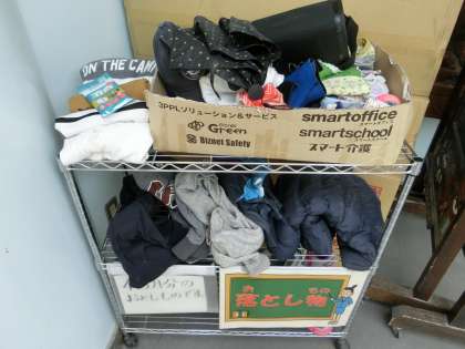 体育館入口の落とし物コーナーに「4・5月分の落とし物です」と表示がありました。2か月近く、ここで過ごしているグッズもあるということになります。