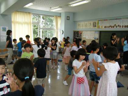 最後に1、2年生でペアを作り、「アルプス一万尺」で楽しく遊びました。