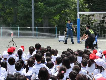 後半は初期消火について学ぶコーナーでした。火を発見した子どもたちが大声で
