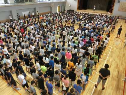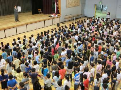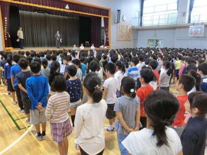 体育館に集まって来た全校児童は、いつも通りの態度と姿勢です。室内はちょっぴりムシムシしていましたけれど、気持ちはジメジメしていませんね。
