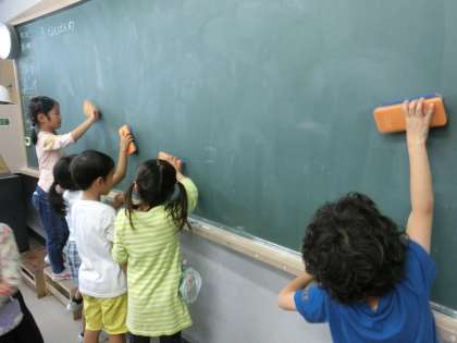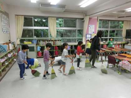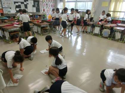 先週、おそうじ教室で腕前をあげたと評判の1・2年生が、張り切って清掃している現場へ直行しました。掃いたり、拭いたり、机を運んだり…。一人ひとりが任された仕事をがんばる姿が見られました。イコール、今週の生活目標を達成できていることになります。