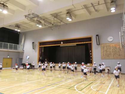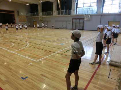 2年生のシャトルランでパートナーの5年生が大活躍、低学年児童にはまだ難しい仕事のお助けマンとなっています。正確にカウントしたり、エンドラインを越えているかをチェックしたりして、体力テストの精度向上に貢献していました。