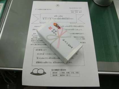 そして、お昼すぎ、本部役員の皆様が各教室へ、PTAからの紅白まんじゅうを届けてくださいました。お便りも添えられています。