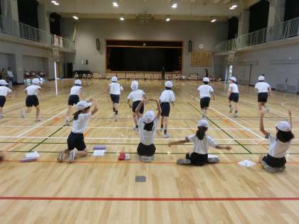 4年生のシャトルランです。先輩たちの姿は見えません。もう自分たちの力で、お互いの記録を見合っていくことが成立するようになっているからです。低学年と違うのはそれだけでなく、持久力も高まっているため、そう簡単にはギブアップしません。70回を超えて走り続ける子も現れています。