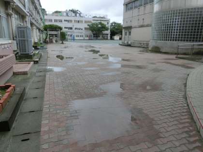 ひんやりとした朝、雨はあがっていますが、犬走りには水たまりが残っています。