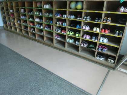 朝会終了直後の靴箱をさっそく見に行ってみました。これは1年生の様子です。目標を意識して並べていますね。