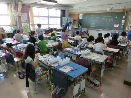 絵の具を使って運動会の絵を描いています。水をこぼさないように、水道と教室を往復することも、2年生にとっては一仕事なのです。うっかりすると、洪水が発生してしまいますからね。