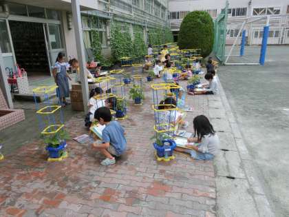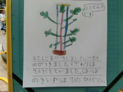 1年生は定期的にあさがおの生長具合を観察しています。絵の表現を中心に、徐々に平仮名による記録もできるようになりつつあります。