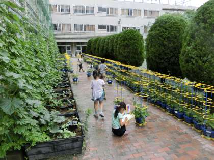 今日は支柱に絡んだつるの長さを、先生に測っていただき、その伸び具合を知って喜ぶ子も見られました。