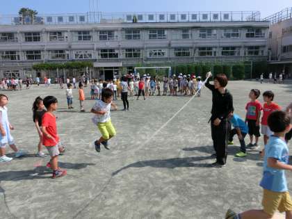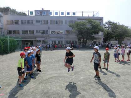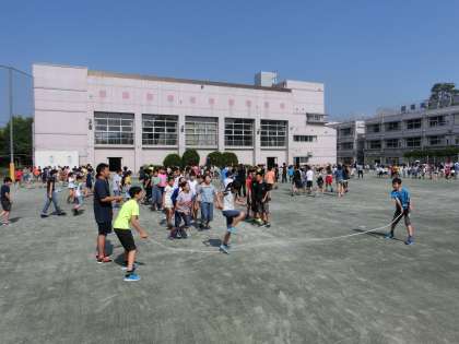 体育朝会、今日は偶数学年が二度目の長縄チャレンジです。