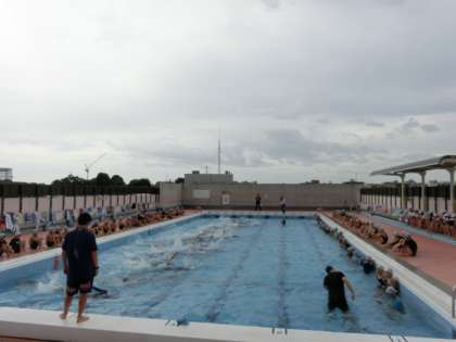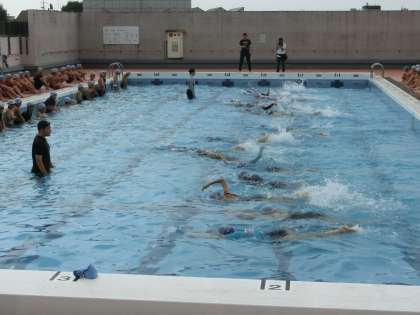 パッとしない雲ゆきながら、気温と水温が基準値に達し、水泳指導を実施できました。6年生が活動しています。