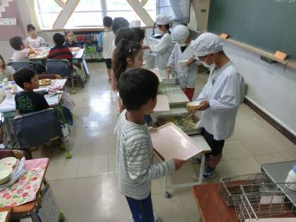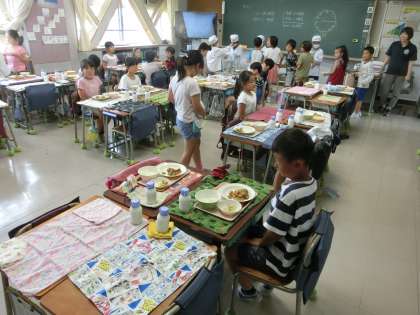 給食の準備を進める時間になりました。走り回って、埃を巻き上げたり、大騒ぎしたリすることなく、落ち着いて配膳がなされています。これも食事以前の大切なマナーですね。