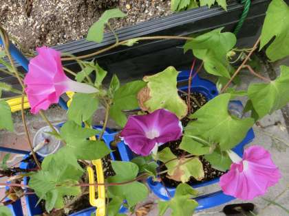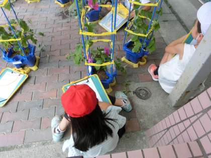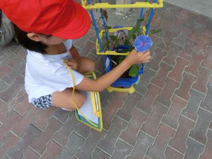 ブルー、ピンク、パープル、朝顔が色とりどりに花開いています。1年生は大喜び。水やりやスケッチも、いつも以上に張り切って行っていましたよ。