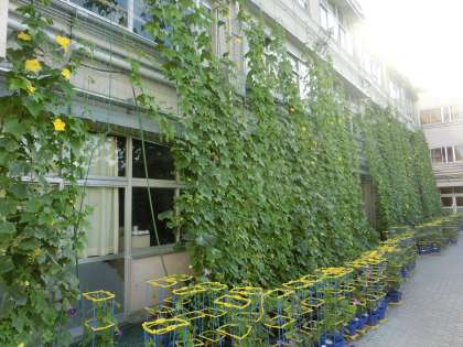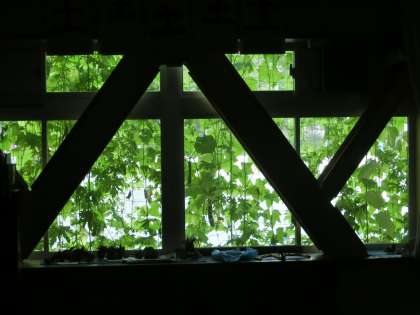 つるが3階にまで達したグリーンカーテンも見られるようになってきました。教室内から外を見るとご覧の通り。強烈な日射をブロックしてくれています。