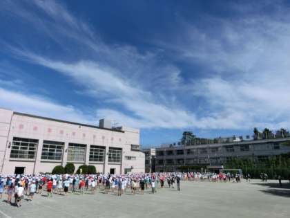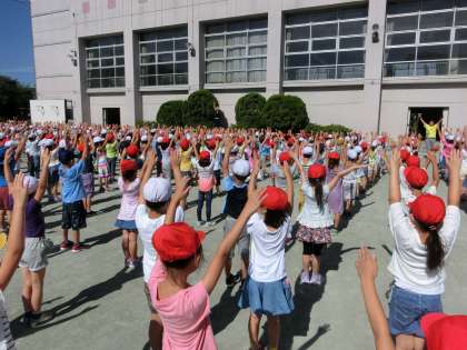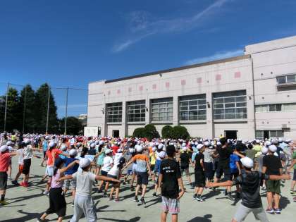 体育朝会はラジオ体操です。指先までピンと伸ばし、きびきびとした動きを意識して取り組むと、すごい運動量になるとご存知でしょうか。授業前に、子どもも大人も、しっかり汗を流しました。