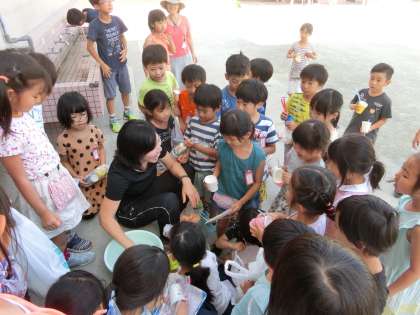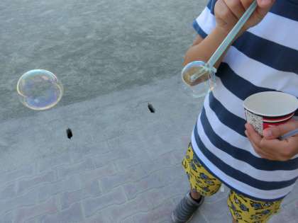 石鹸水からシャボン玉を飛ばしている1年生にも出会いました。やみくもに勢いよく吹くのではなく、大きな玉を作るコツも自分自身で見出していました。みんな大喜びです。