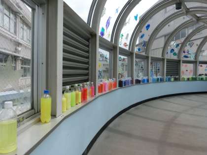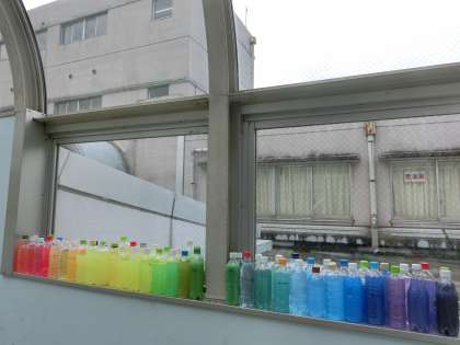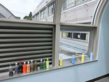 2か月ぶりに登場の展望廊下です。別称「松丘アクアリウム」を通りかかると、カラフルなペットボトルが並んでいました。レモネードからサイダー、ブラックコーヒーまで、バリエーション豊か。正体は、図工「にじいろコレクション」で2年生が作った色水の数々でした。