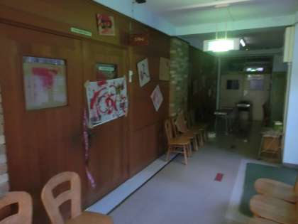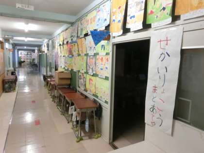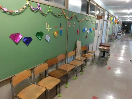店開きに対する子どもたちの意気込みと、おまつりを楽しみにしている期待感が伝わってくるような校舎内です。あと数時間後、この廊下は、みんなのワクワクした顔であふれているのでしょう。ランチルーム前もいつもと違う、気配が漂っていました。