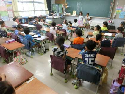 各学級で行っている朝の会、健康観察のプログラムは必須です。1年生のとあるクラスでは、出席番号順でリレー式に友達の名前を呼び、それに答える形で、「ちょっと喉が痛いです。」「元気です。」といった具合に、全員のコンディションを確認し合っていました。