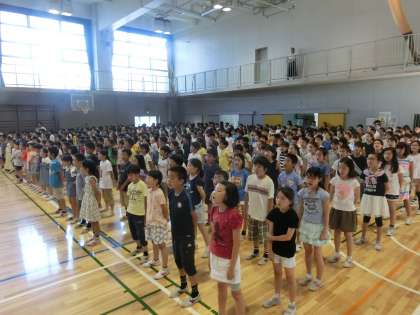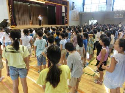 校長先生からは大きく二つのお話がありました。一つ目は「一学期を振り返っての自分」、二つ目は改修工事、水泳指導後の速やかな下校、熱中症予防等の「夏休みへ向けて」でした。