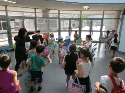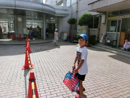 夏季水泳指導がスタートです。受付開始前から低学年のみんなの長い列ができていました。1年生は手順に慣れていきましょうね。