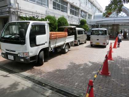 正門付近には工事用車両が駐車し、通行路との境界にはこのあと壁が設置されます。プール等への来校には支障なく、安全面を第一に配慮して作業を進めていきます。