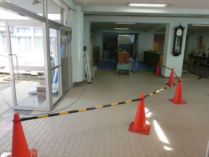 6年生の靴箱から西側階段へ向けて工事関係者や物品搬出入のルートとなるため、一般の通行は不可となります。3階の図書館へ行く際には、中央階段をご使用ください。