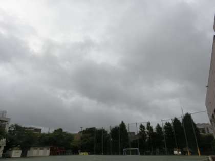 台風通過に伴い強風が吹き荒れる朝です。コンディション不良のため、第一部の水泳指導は中止といたします。第二部につきましては、今後の状況を見て決定します。