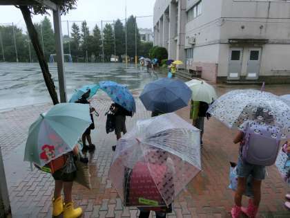 雨が降り出してしまい、傘をさしての登校となりました。新学期初日ゆえ、手提げバッグもあって、低学年の子はちょっぴり大変そう。でも、汗がダラダラという姿はありませんでした。