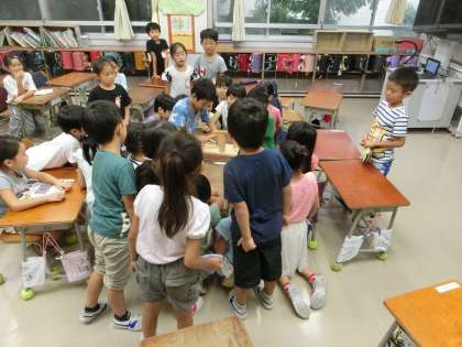 朝の時間を活用して、夏休みの自由研究作品を紹介し合っている学級が多く見られました。お友達の大作・傑作の数々に自然と取り巻きができます。