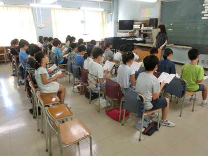 5年生が新曲『この星に生まれて』に聴き入っています。さっき屋上プールを目にしたばかりの私からすると、音楽室は一変して秋の風情です。この曲を初めて知ったという子も少なくありませんでした。これから合唱練習が始まり、音楽朝会で披露する大役を担っているそうです。活動は今まさにスタートしたばかり。今後どのように伸びていくのか期待していますよ。