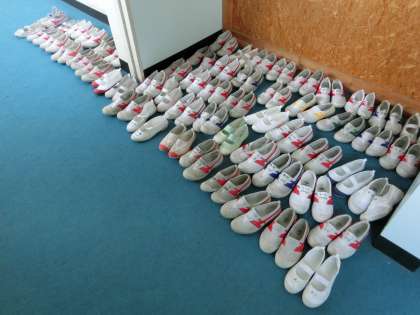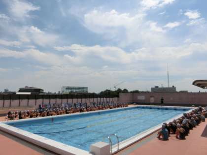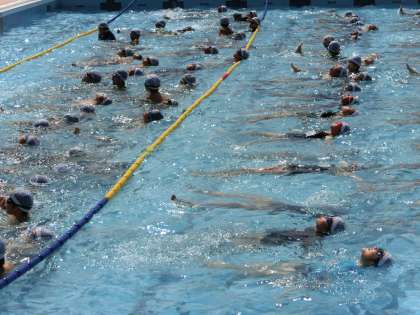 その前に、『勇気100%』のリズム泳で水慣れを。指導者が示範する様々な動きを模倣しながら、無邪気に取り組む姿を見てしまうと、好感を抱かずにはいられません。よい意味での子どもらしさを失うことなく、精神的にはすくすく育っている最上級生がいる学校、最高です!