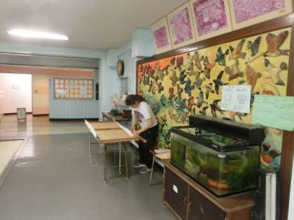 各教室や廊下には、夏休みの自由研究作品がズラリ。見ごたえ十分ですよ。