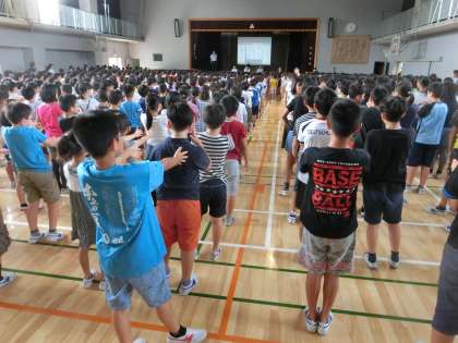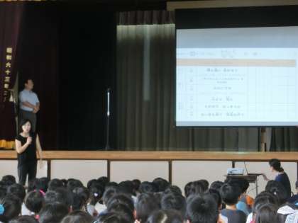 児童朝会では、「あそべくつ」カードの説明がありました。めあてをもち、全校で取り組んでいきます。校長先生からは、特にあいさつについての願いをお話いただきました。