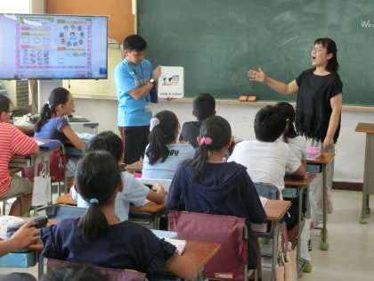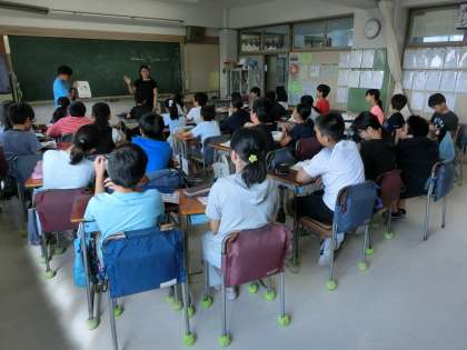 6年生の外国語活動、担任と英語活動支援員がTT体制で、テンポよく指導しています。