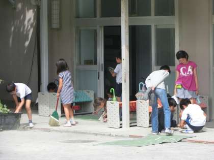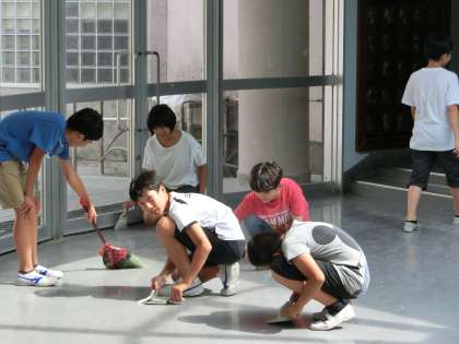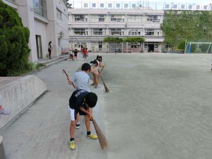 校庭で遊ぶ学年がいる傍ら、他学年はいつも通りの掃除タイム。各学年にロング昼休みの機会が均等に与えられていますから、「いいなぁ」なんてぼやく子はいません。