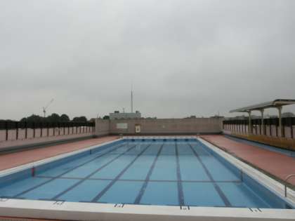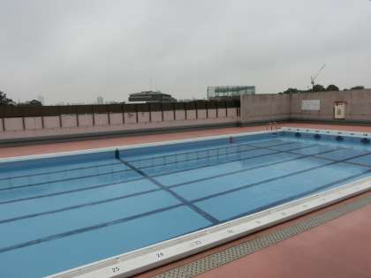 この夏、何度も足を運んだ屋上プール。そこにはいつも子どもたちの元気な姿と、まぶしい太陽の光がありました。雨が降りしきる今朝は、そんな猛暑の日々が嘘のような寂しい構図です。