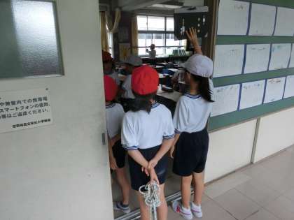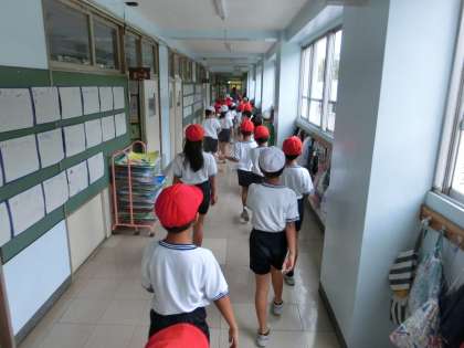 教室から校庭へ向かう2年生が、約束を守って歩行するという基本的な規律について今一度徹底を図るべく、がんばっている姿に出会いました。応援していますよ。