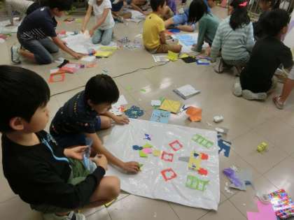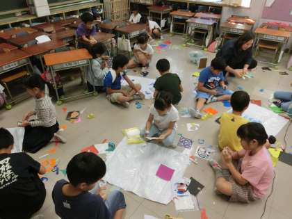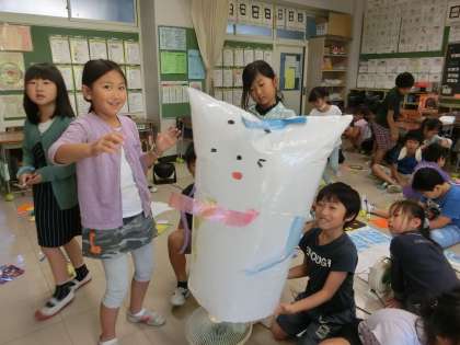 楽しい飾り付けを完了させたグループから、送風機の上で手を離し、空中浮遊させています。4年生の理科学習にも関連のある活動内容です。