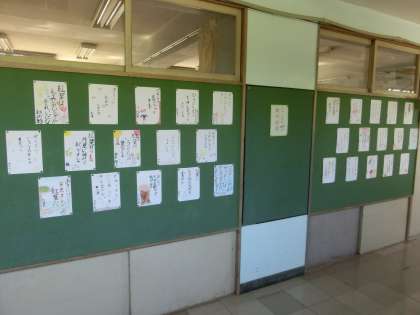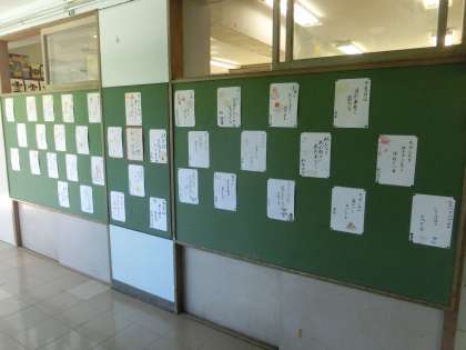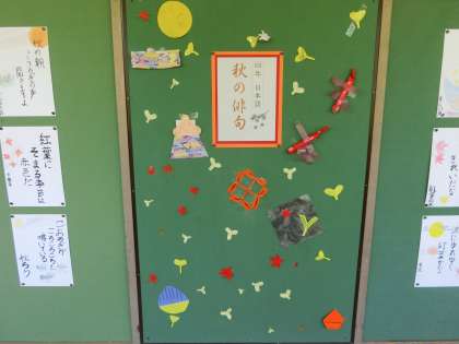 音楽の時間、「もみじ」の合唱練習に励む4年生の廊下には、教科 日本語で詠んだ秋の俳句が並んでいます。ここでも赤や黄色の挿絵が目立ち、題材として紅葉を取り上げている子が多いことを窺わせました。