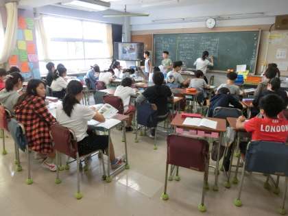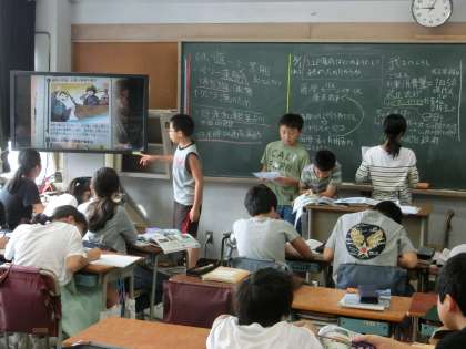 6年生の社会科では、グループ毎に発表を行い、学習問題について理解や思考を深めていました。視聴覚機器の活用や板書も全て子どもたちに任されています。