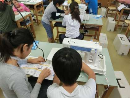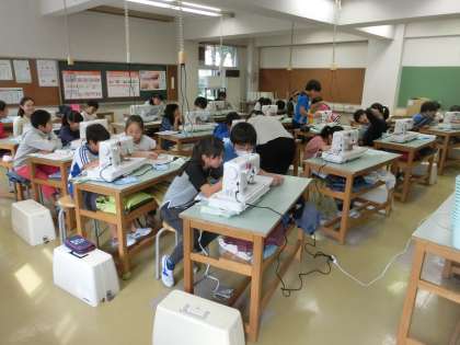 家庭科学習がスタートして半年の5年生は、手縫いにとどまらず、ミシン縫いもマスターしつつあります。2人一組で作業を和やかに進めていましたが、困ったときはあちらこちらから先生お助けコールがかかり、指導者はさながら商売大繁盛の様子でした。