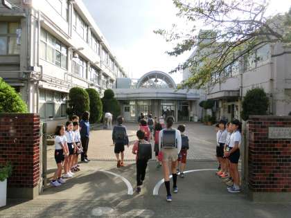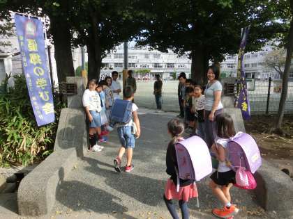 主事室前でタグをピックアップして、4年生が担当場所へと向かいます。正門と南門で、登校して来る仲間を元気よく迎え入れてくれていました。