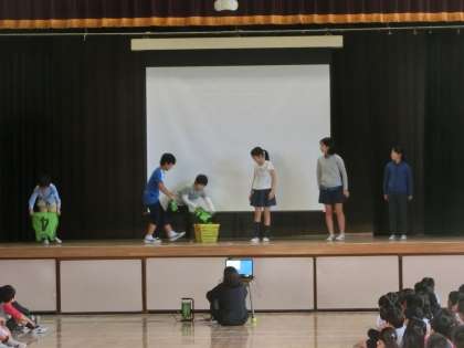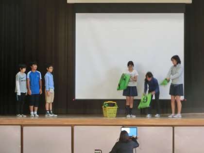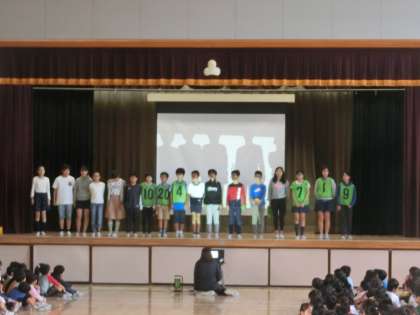 運動標語「た い り ょ く」についての解説をはじめ、学校生活上心掛けてほしいことのアナウンスなど、笑いも交えつつ、楽しい発表を見せてくれました。