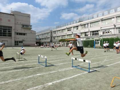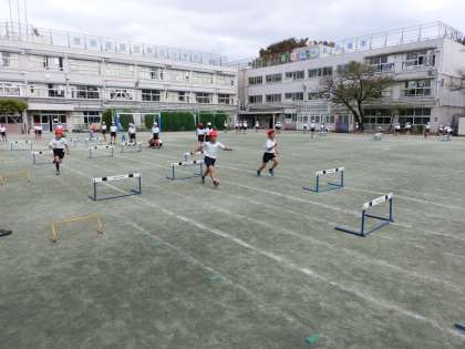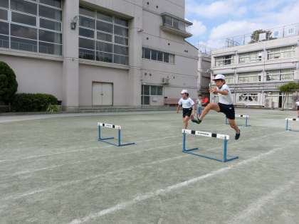 校庭では4年生のハードル走が花盛りです。2つの学級が活動していました。
