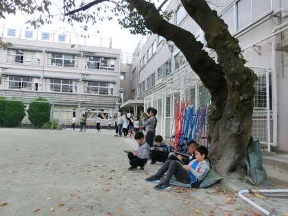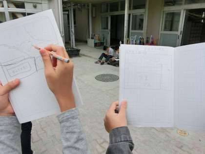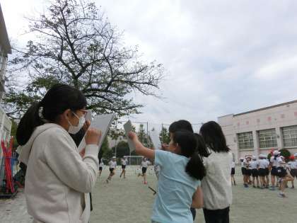 理科で気象単元を学習中の5年生が、空のスケッチをしています。たまたま雲の特徴をとらえにくい空模様だったにもかかわらず、「描けない、無理ぃー」ではなく、健気に表現しようと取り組む姿が好印象でした。