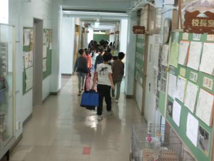 職員室で執務中、廊下を子どもたちの一団が通過している気配をかすかに感じました。扉を開けてみると、3年生のとあるクラスのみんなが、図書館から教室に戻っている途上でした。よくできました!